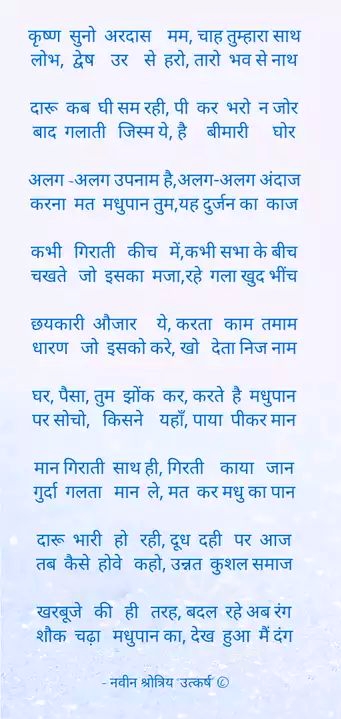 कृष्ण सुनो अरदास मम, चाह तुम्हारा साथ लोभ, द्वेष उर से हरो, तारो भव से नाथ दारू कब घी सम रही, पी कर भरो न जोर बाद गलाती जिस्म ये, है बीमारी घोर अलग -अलग उपनाम है,अलग-अलग अंदाज करना मत मधुपान तुम,यह दुर्जन का काज कभी… Read more